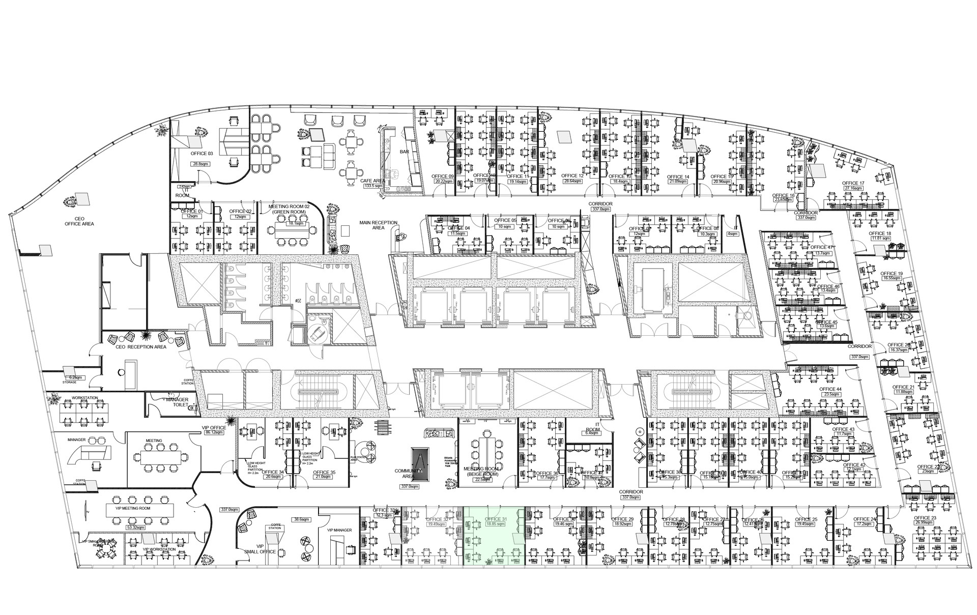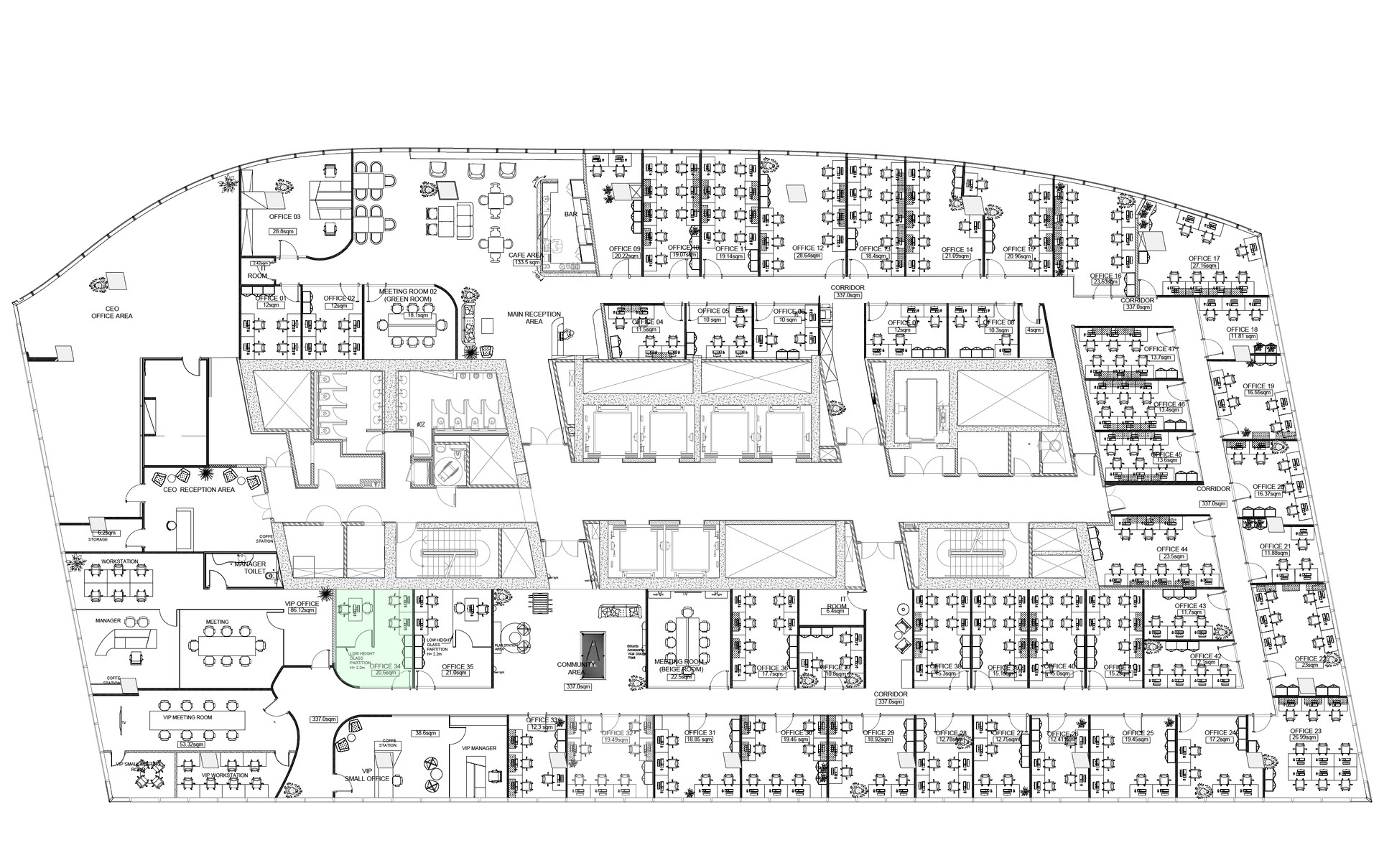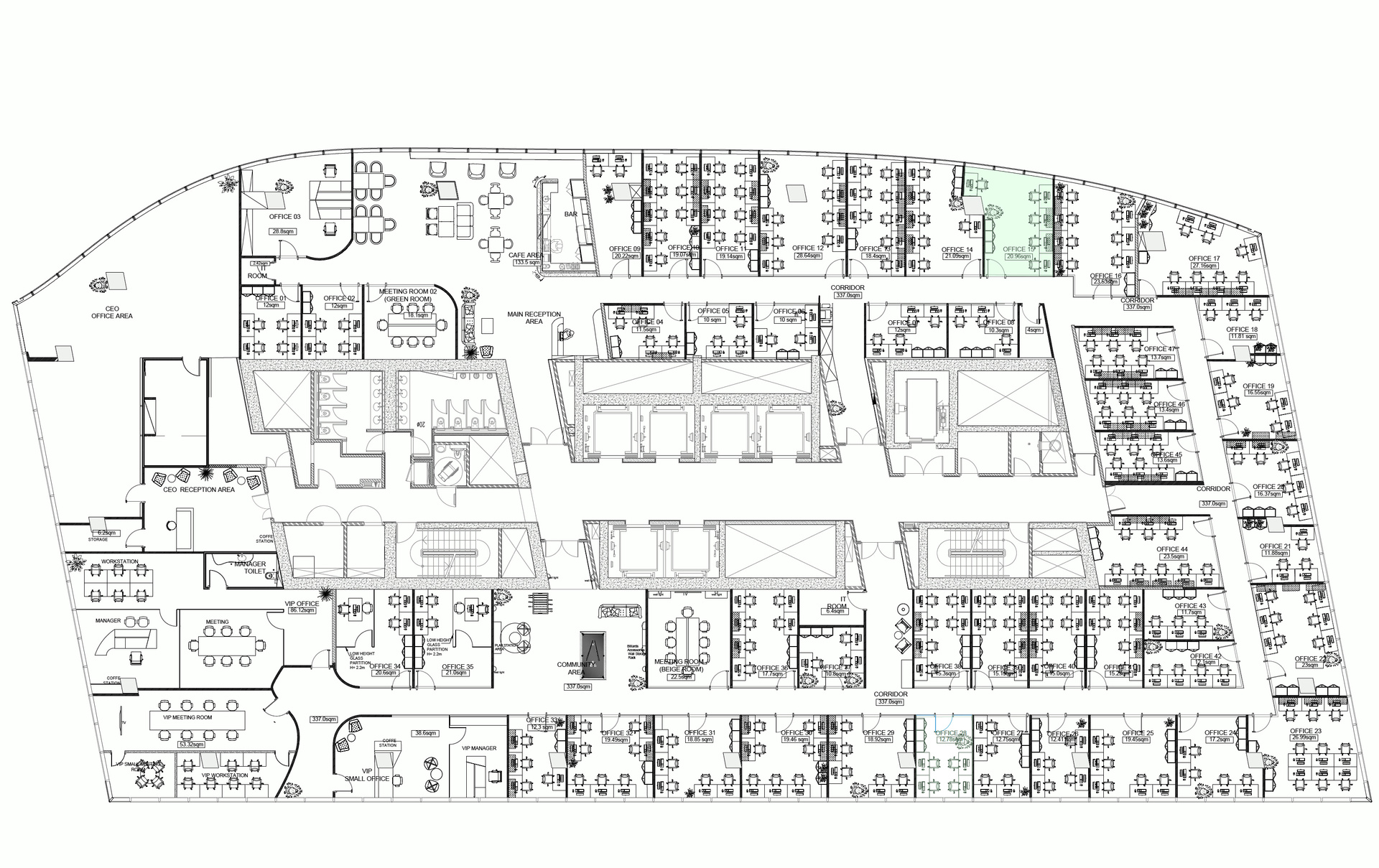 - Mixed-use office planning (open space + private units)